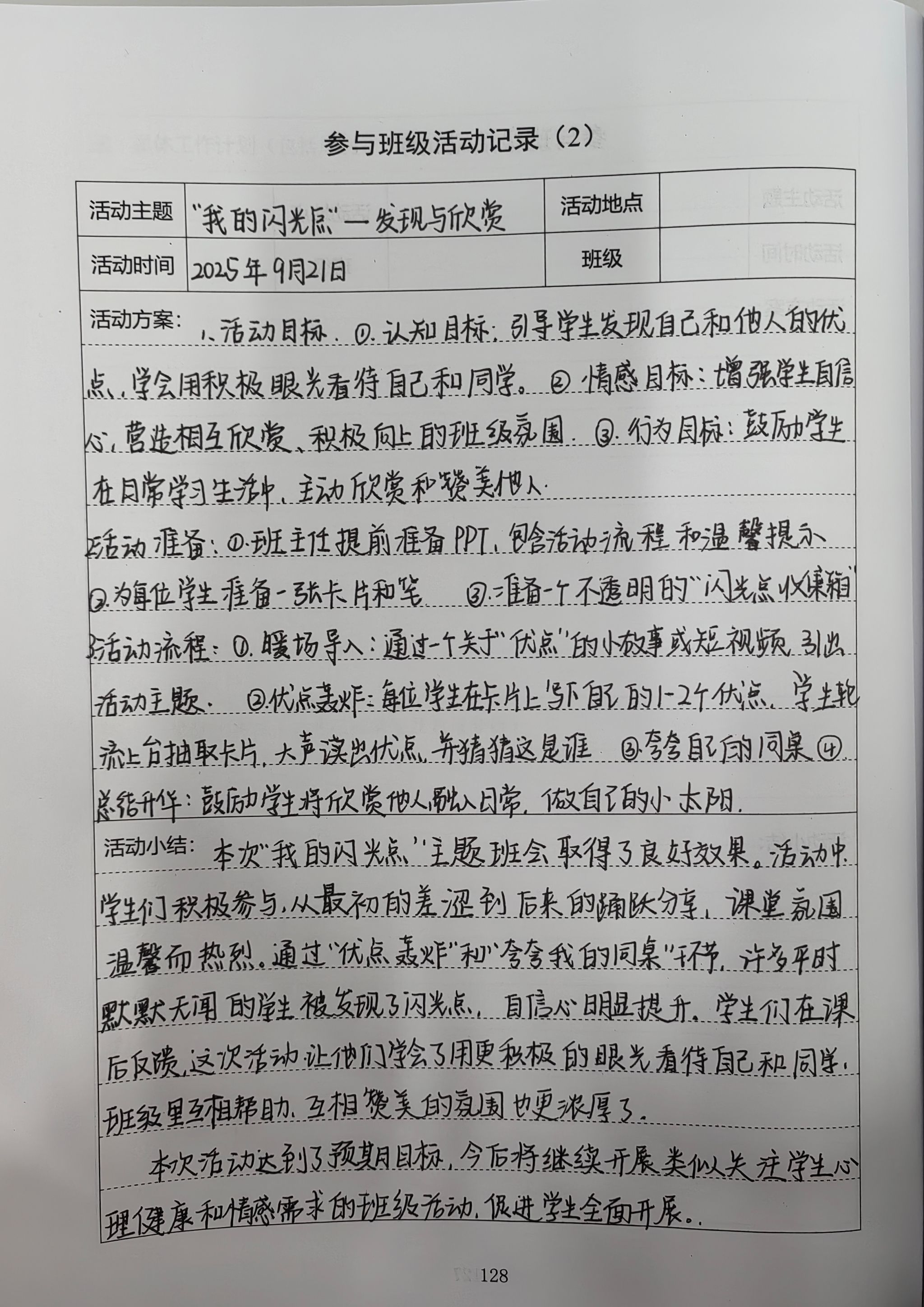 一把钥匙开一把锁。初入课堂时,我曾试图用统一的标准要求所有学生。但每个孩子都是独一无二的,我利用课间时间与学生平等交流,扮演"倾听者"角色,当学生感受到被理解和接纳时,他们更愿意敞开心扉。我开展了一个班级活动记录,发现自己的闪光点,学生重新找回自信,发现了自己的无限潜能。