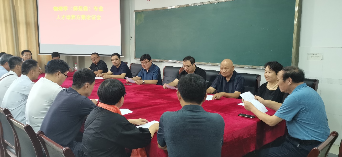 论证会上,专业负责人张运海主任详细介绍了本次培养方案的修订背景、意义和要求,以及目前执行的培养方案在对标国家师范生培养新标准存在的问题和不足。各位专家围绕人才培养目标定位、专业毕业要求、课程体系设置、实践教学等方面提出了针对性的指导意见,为培养方案的修订提供了重要参考。随后,参会人员就如何进一步修改和完善培养方案进行了充分的讨论和交流。会上,徐兴磊院长指出,人才培养方案是教学工作的根本依据,直接影响到人才培养工作的方向、规格和质量,我院高度重视人才培养方案的修订工作,将充分征求中学名师、教育专家、用人单位、往届毕业生及一线教师意见,希望与会专家多提宝贵意见,帮助物理学专业进一步修订完善对接国家教育发展战略需求和地方基础教育改革需要的人才培养方案。