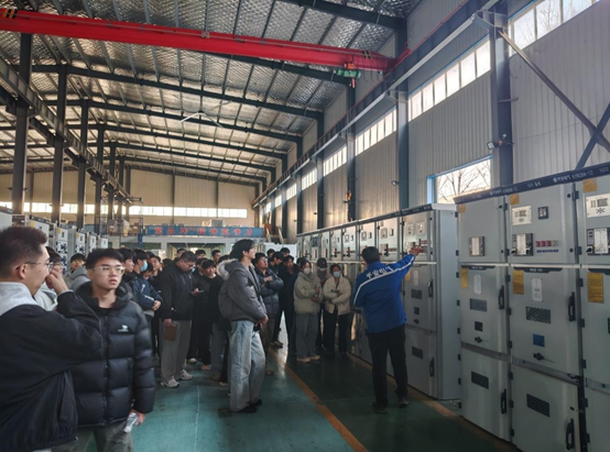 见习活动在企业技术闫总工的欢迎致辞中拉开序幕。接着在集团综合部贺经理、运维事业部王经理、成套事业部孟主管及其他企业工程师的引导下,学生们先后参观了智能运维监控中心及电力工程展示区、光储充一体化示范站、高低压成套设备生产车间,深刻理解了企业秉持“以客户为中心”的核心价值追求、“科技让用电更安全,服务让用电更放心”的服务理念等企业文化内涵;真正领会了充电桩智能数字化箱变的工作原理、技术优势及市场应用前景;近距离观摩了KYN28A-12高压柜、MNS低压柜等核心产品的生产流程、核心组件及柜内接线逻辑结构;同时,也使学子们亲眼见证了电气设备从零部件加工到整机设备调试的全链条工艺。