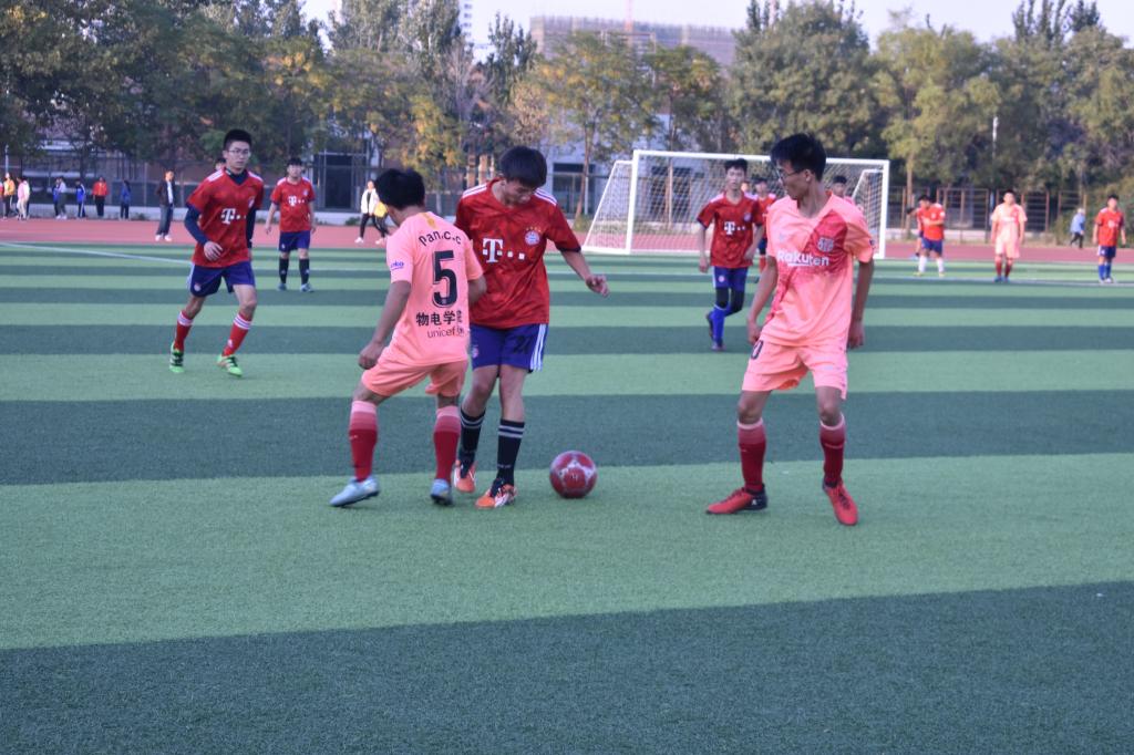 随着主裁判一声哨响,两队开始了激烈拼抢。开场仅十分钟,我院队员的一记中距挑射成功将球送入球门,瞬间点燃了场旁观看助威的同学的热情。接下来的比赛双方队员你来我往,表现出色。精湛的脚法、完美的盘带、犀利的射门以及精彩的配合将比赛彻底推向高潮。在一片欢呼声中,上半场比赛结束。休息过后,双方又进行了后半场的激烈鏖战。双方展开了对攻模式,运动员们奋力拼搏,奔跑如离弦之箭,喊声振奋人心,青春的活力在绿茵场上肆意的绽放。