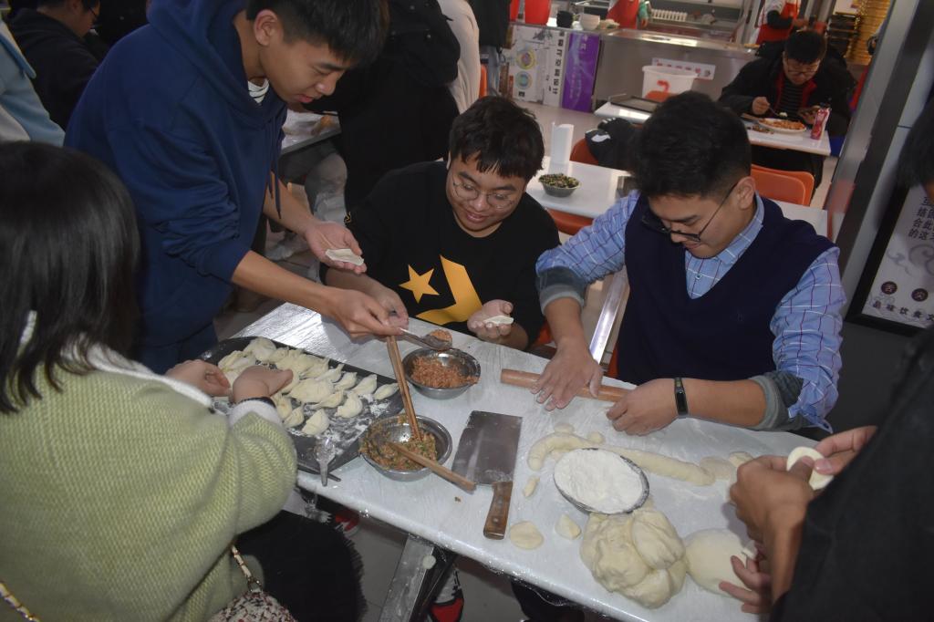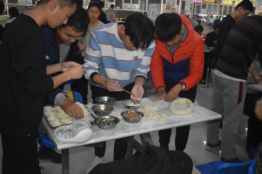 中午12:00,同学们准时在锦苑餐厅集合,同学们以班级为单位有序领取面粉和馅料,然后到食堂指定的桌子上以小组为单位包饺子,从和面到擀面皮再到包饺子,无不透露着同学们一丝不苟的态度,师生相处和恰,其乐融融。饺子包完以后,统一由食堂进行烹饪,最后由班长去领饺子,分到各班,热腾腾的饺子,暖洋洋的心,整个食堂洋溢着温馨和睦的氛围。