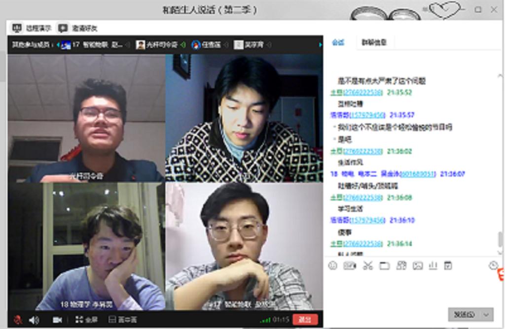 晚8:00,活动正式开始。先由活动主持人刘奇同学带头介绍莅临活动的老师、同学,并互致问候。随后,各同学轮流开麦分享自己的寒假生活与经历,由主持人总结后进入第二环节——好书推荐环节。本期推荐的书籍为江南的《龙族》,阐述完推荐理由后,活动进入第三环节——热点讨论环节。本期的话题是“钉钉被打一分,你怎么看?”,同学们首先踊跃表达对于学校开展网课教学内心的真实想法,吐槽着学习通、慕课等学习交流平台的卡顿问题,弹幕中刷着各种网络流行语,老师与同学们交流密切,现场气氛十分活跃。随后,主持人与活动嘉宾依次就“钉钉差评事件”发表了自己的看法。然后,同学们对“疫情结束之后各产业的发展趋势”进行了简要的讨论,并有请老师发表意见。最后,由主持人进行本期活动总结,并有请老师以及观众对本次活动的举办情况发表意见。