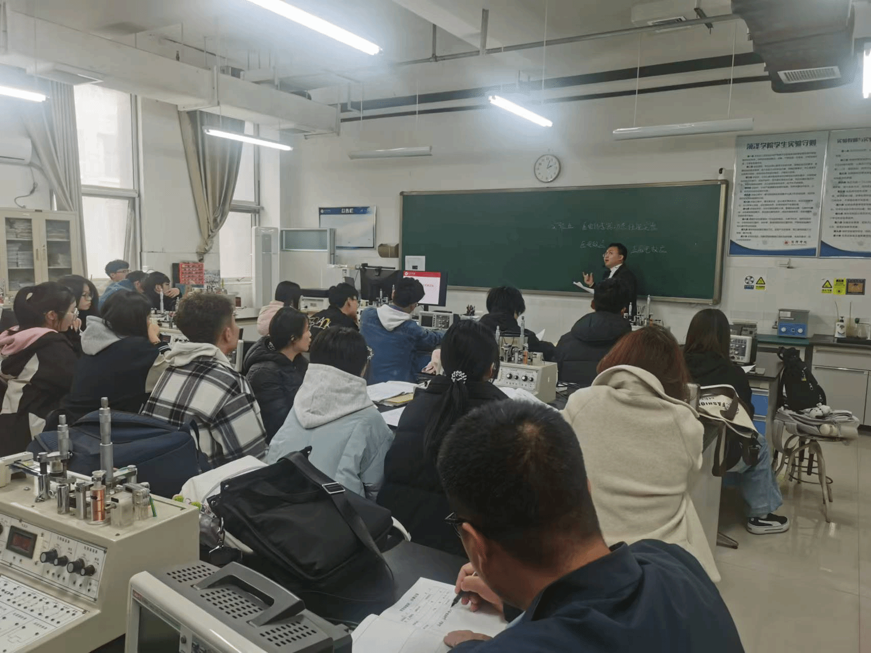在实验授课过程中,任课老师精神饱满,热情洋溢,积极培养学生对仪器的规范性操作能力、实验创新意识和严谨的科研作风,鼓励学生自主实验,激发了学生实验兴趣。学院教学督导专家们认真聆听,课后与任课教师进行了面对面交流评课,有针对性地指出了任课教师在实验教学过程中的问题,促使教师不断反思和改进自己的教学方式,有效促进了实验教学质量提升。