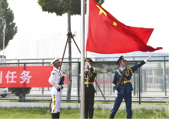 在嘹亮的国歌中,2023级新生军训动员大会正式开始。孟令美作动员讲话,并向伟德国际1946bv军训团教官大队队长董学峰授团旗。工作人员宣读伟德国际1946bv2023级新生军训团编制及军事训练暂行规定。马克思主义学院2023级学生张书馨代表新生发言。军训教官、伟德国际1946bv国旗护卫队政委李孟宇代表军训教官发言。伟德国际1946bv军训团教官进行军事技能展示。