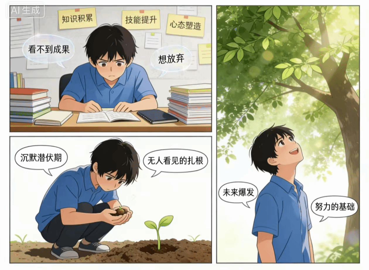 在大学生成长与心理发展研究中,90%以上的成长瓶颈并非能力不足,而是因看不到即时成果而提前放弃。当个体处于知识积累、技能提升、心态塑造的关键阶段,往往会因外在无明显变化陷入焦虑,甚至否定自身努力。心理学中的“种子效应”恰好证明:成长必然存在沉默潜伏期,无人看见的扎根,正是未来爆发的基础。