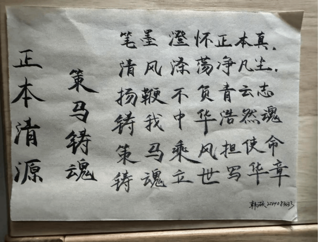 活动中,同学们铺纸研墨、凝神静气,将廉洁之思与青春之志倾注笔端,在横竖撇捺间诠释对廉洁的理解。他们以笔墨为媒,将廉洁教育融入日常书写,于潜移默化中厚植崇廉尚洁的理念。颜体楷书“公生明,廉生威”笔锋刚劲如松,尽显清正风骨;行书“不要人夸颜色好,只留清气满乾坤”墨色浓淡相宜,流转着淡泊高洁的志趣;篆书抄录的廉洁古训线条婉转遒劲,藏着对传统廉洁文化的敬畏与传承。同学们纷纷表示,在一笔一画的书写中,不仅感受到了中华书法艺术的独特魅力,更深刻体会到廉洁文化的厚重内涵,今后将端正学习态度、涵养高尚品格,让正气清风在校园中持续流淌。