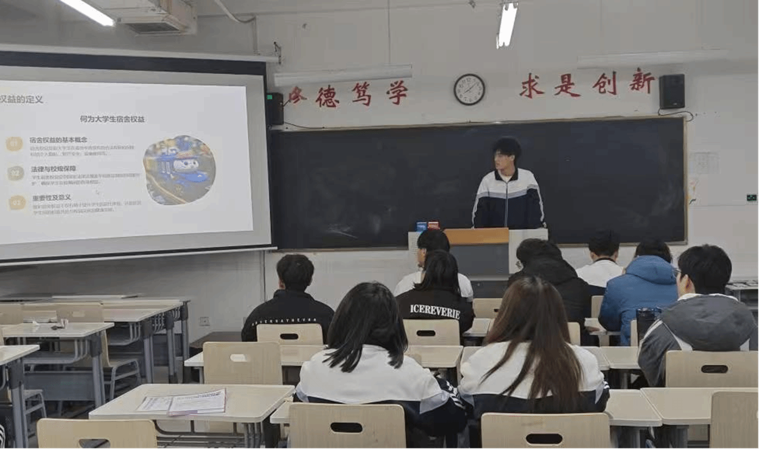学生宿舍是实现环境育人的重要阵地,是学校最小、最温馨的集体,是学生学习和生活的重要场所,更是能体现出学生良好生活习惯的展板。宣讲同学讲解了宿舍常见的权益问题,如宿舍设施损坏维修、食品安全、物品失窃、噪音扰民等,并针对这些问题提出了切实可行的解决办法,避免因权益受损而引发的矛盾与纠纷。随着宣传的不断深入,同学们权益保护意识逐步增强,越来越多的同学自觉参与到维护自身权益的行动中,共同努力营造一个和谐、安全、稳定的宿舍环境。