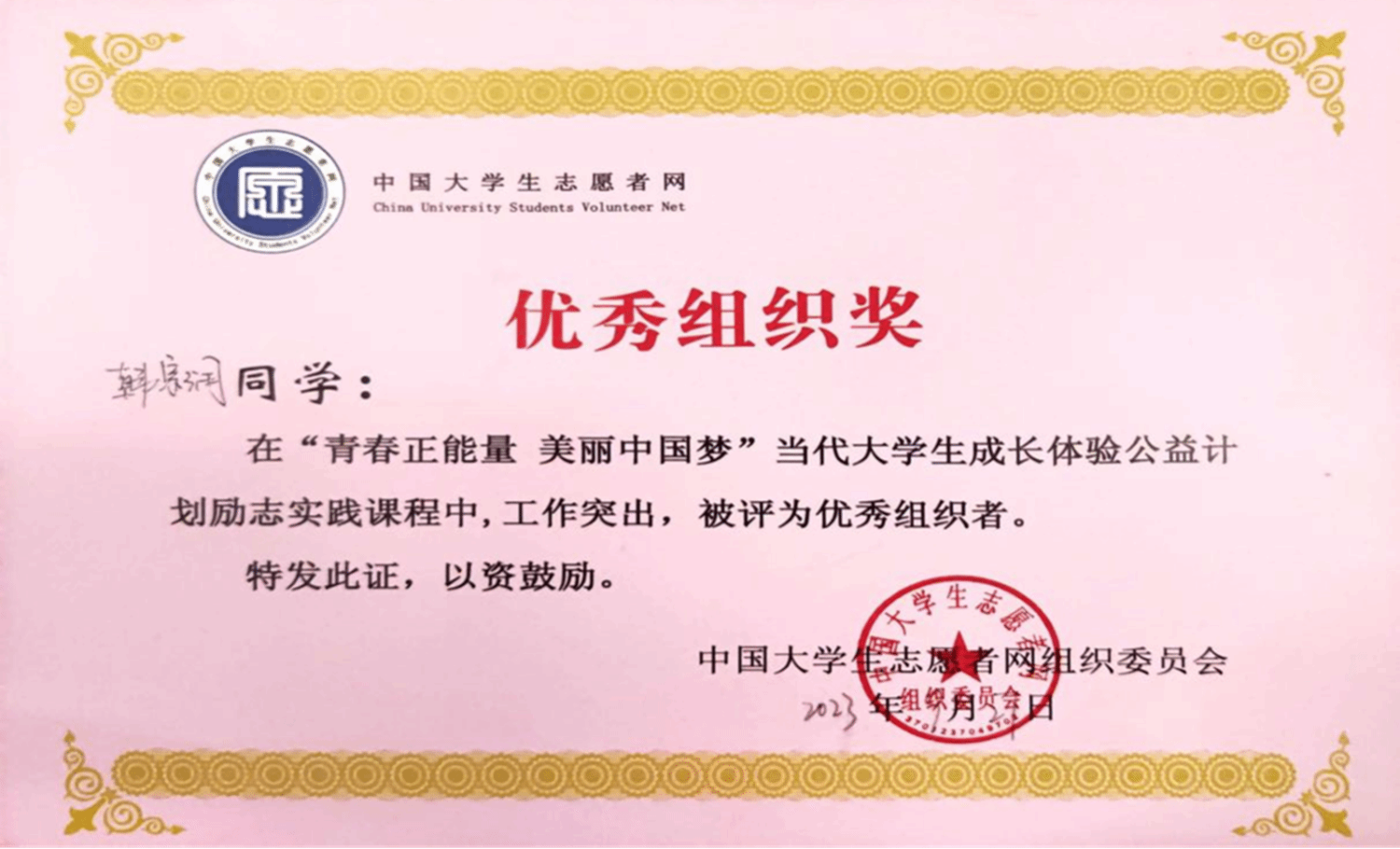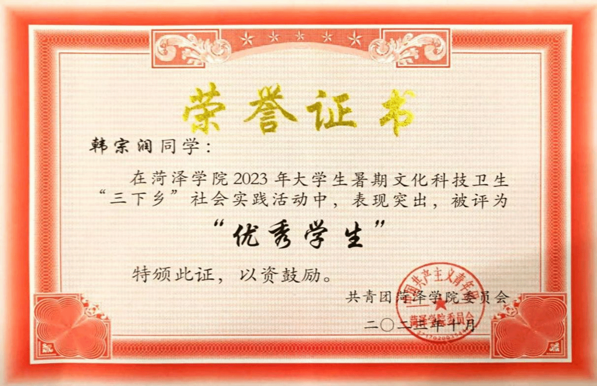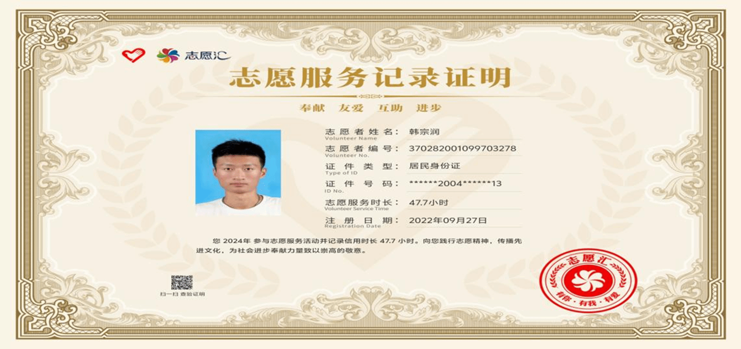 3.有一分热,发千分光。他积极投身社会志愿服务活动,用实际行动诠释奉献精神,参加了暑期“三下乡”社会实践服务队,并在2023年大学生暑期文化科技卫生“三下乡”社会实践活动中荣获“优秀学生”称号;2023年9月被中国大学生志愿者网组织委员会评为“优秀组织者”,为乡村振兴建设贡献青春力量。本学年积极参加志愿服务活动,志愿服务总时长达47余小时。