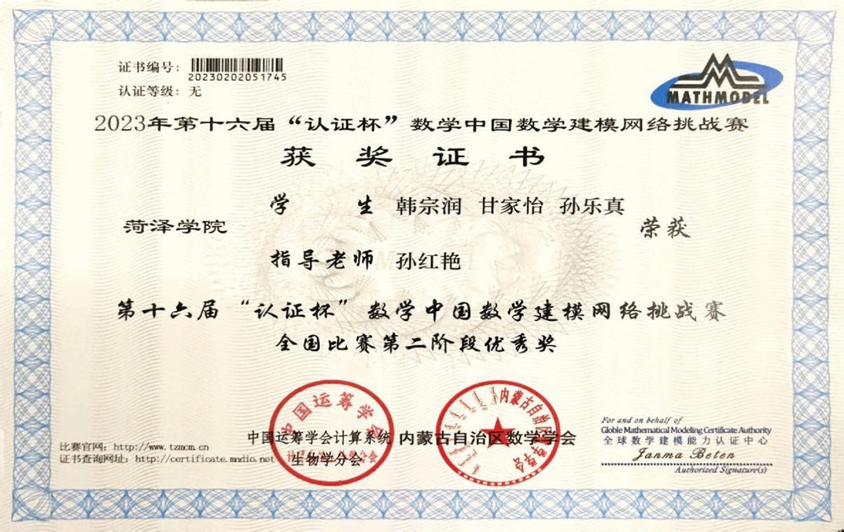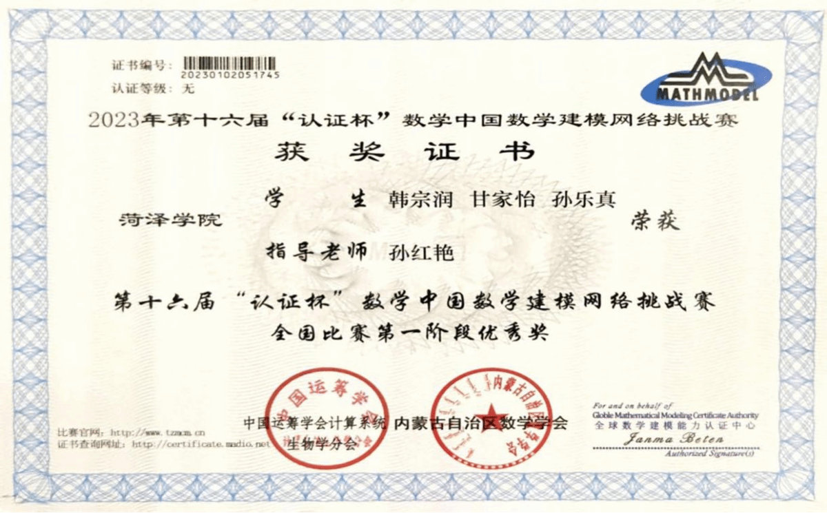 1.2023年9月,获第十六届“认证杯”中国数学建模网络挑战赛第一阶段优秀奖;