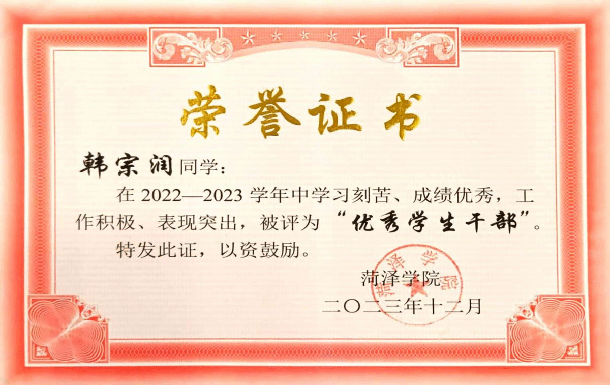 1. 长风破浪会有时,直挂云帆济沧海。在学业方面,韩宗润同学一直保持着突出的成绩。他从入学之初就立下了学业上的目标,努力学习,刻苦钻研。在每一门课程中,他都认真对待,勤奋学习,成绩名列前茅。在2023-2024学年综测排名位于专业第一,曾获得2022—2023学年度国家励志奖学金、伟德国际1946bv优秀学生干部等荣誉;课余时间积极参加科学竞赛,在第十六届“认证杯”数学中国数学建模网络挑战赛第一、二阶段获得优秀奖。
