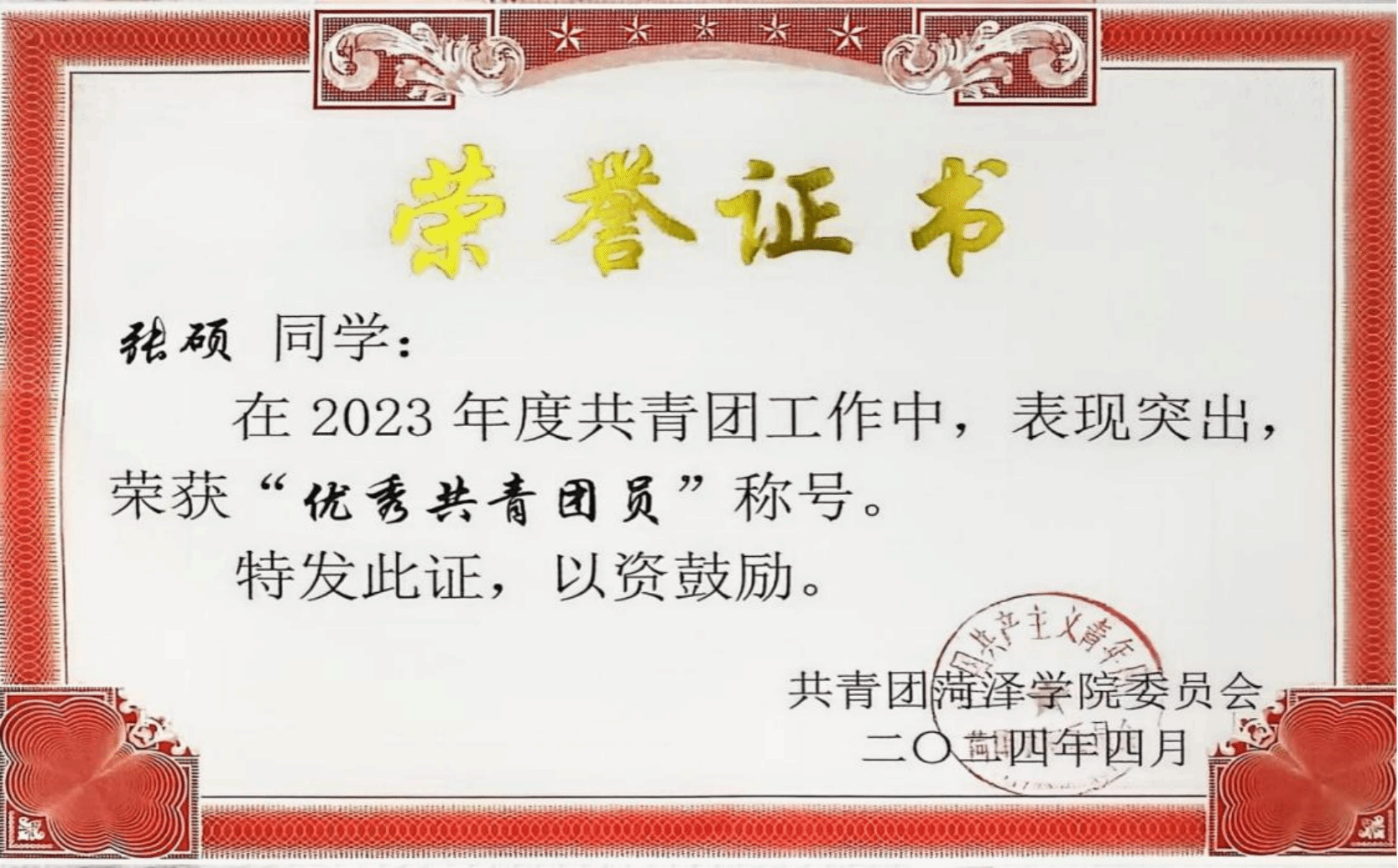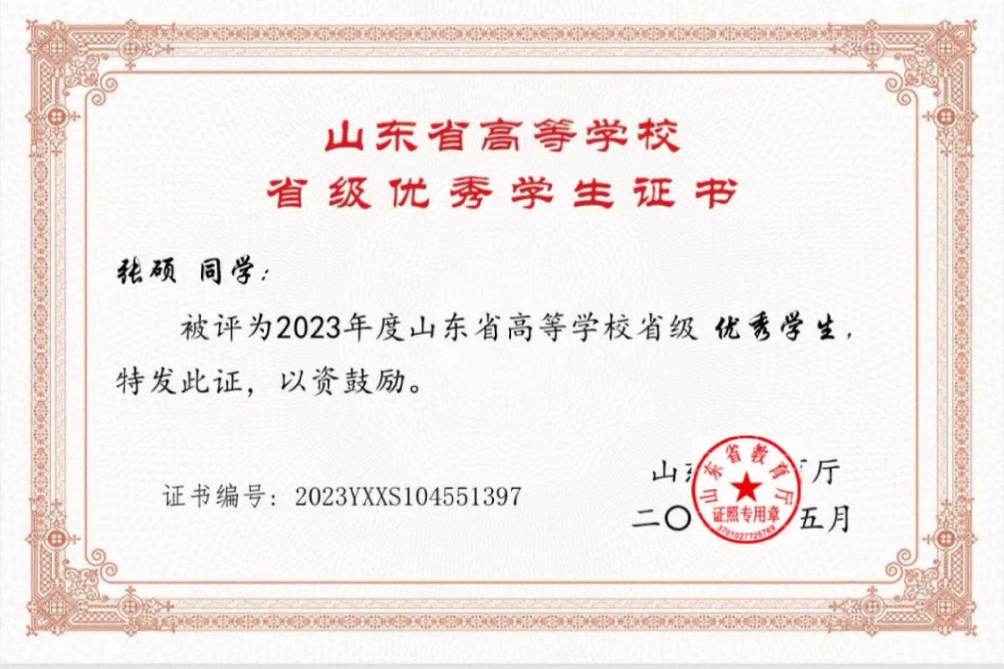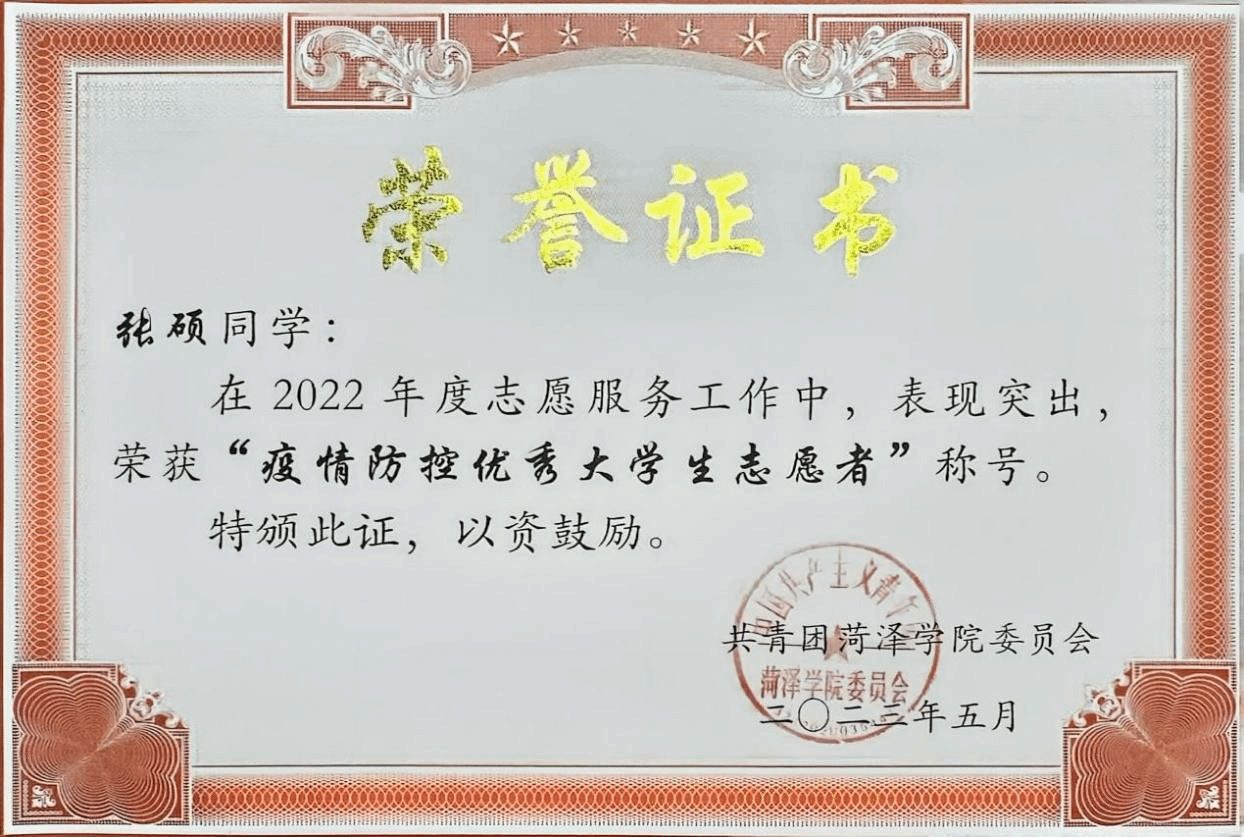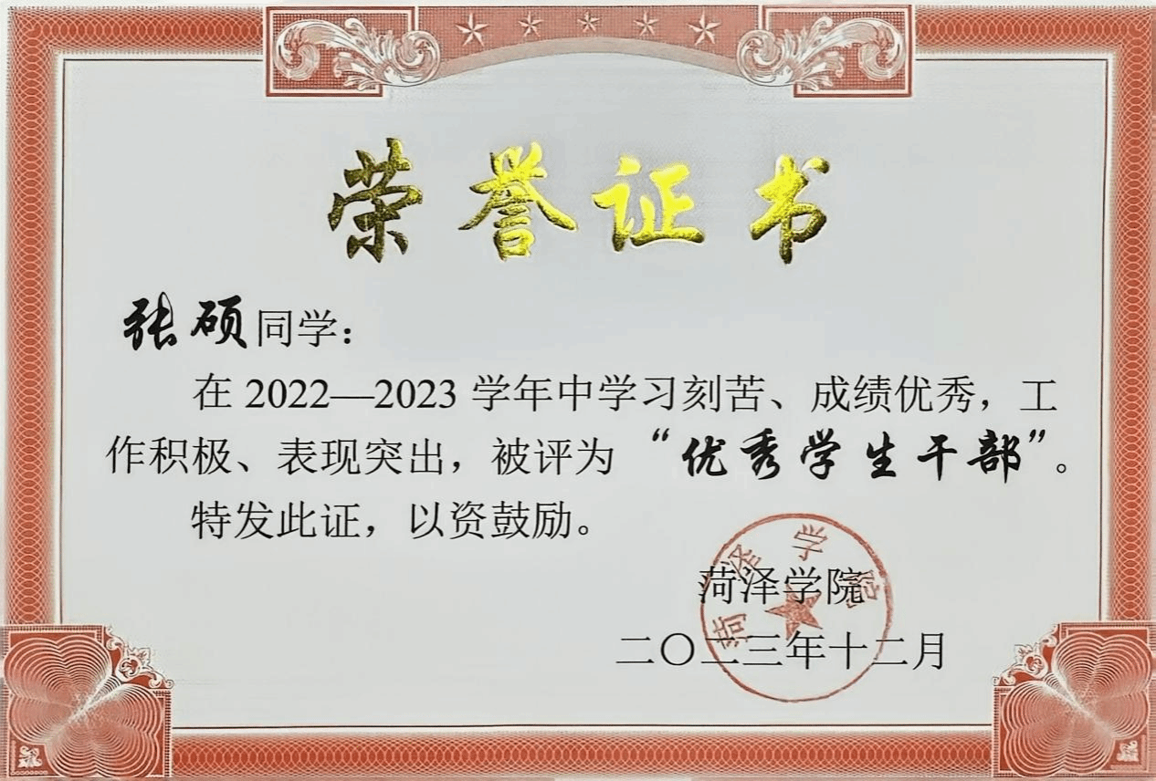 4.2024年5月,被评为山东省高等学校省级优秀学生。