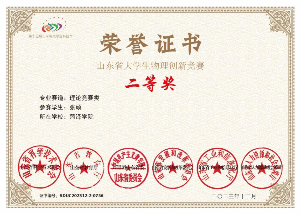 2.2023年12月,获山东省大学生物理创新竞赛二等奖;