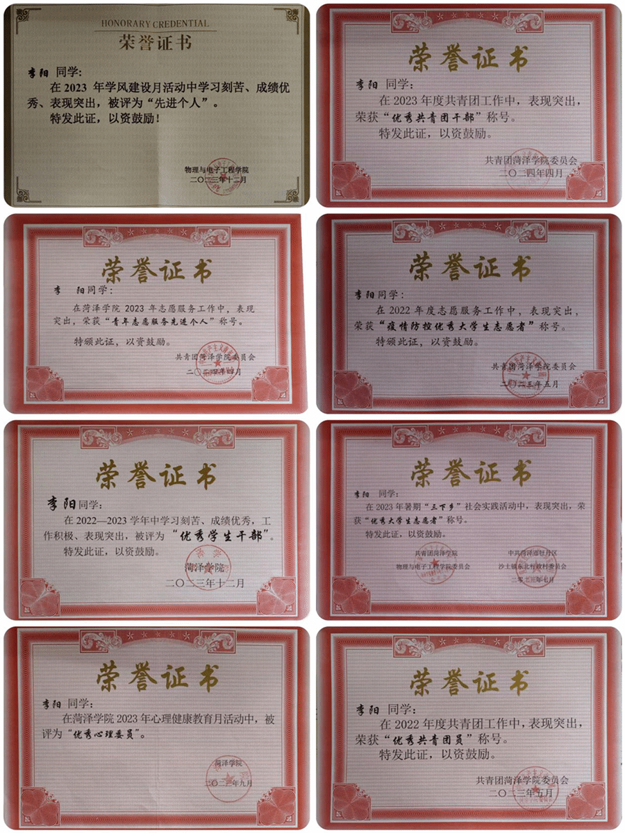 在任职期间,李阳具有较强的组织领导能力和团队协作精神,曾多次获得校级“优秀学生干部”称号、累计获评校园志愿服务活动“优秀志愿者”称号四次。在班级中,对于老师传达的的指令做到具以告之,在规定时间内收齐班级同学的作业和各类实验报告;在校组织和院学生会中,积极组织开展各项团体活动,秉承全心全意为同学服务的宗旨,2022-2024年度累计参与策划组织学生活动30余次,连续两年参加伟德国际1946bv“学生代表大会”和“迎新生”工作,志愿服务时长累计150余小时。