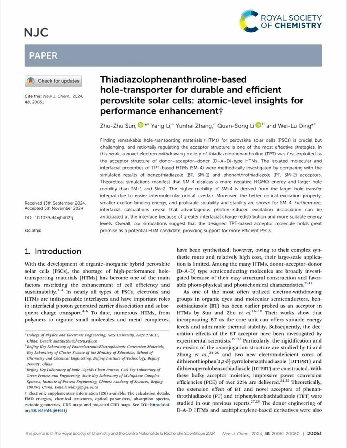 2024年12月,作为第二作者发表论文《钙钛矿太阳电池中螺烯基分子半导体界面与分子调控》被SCI收录;