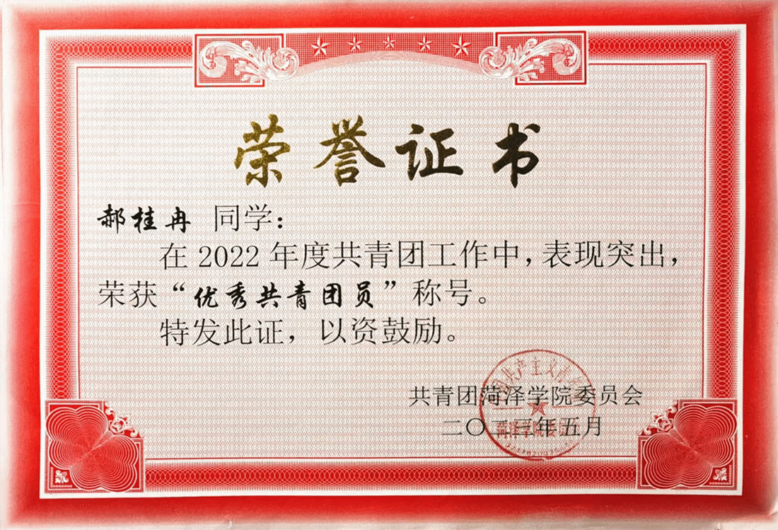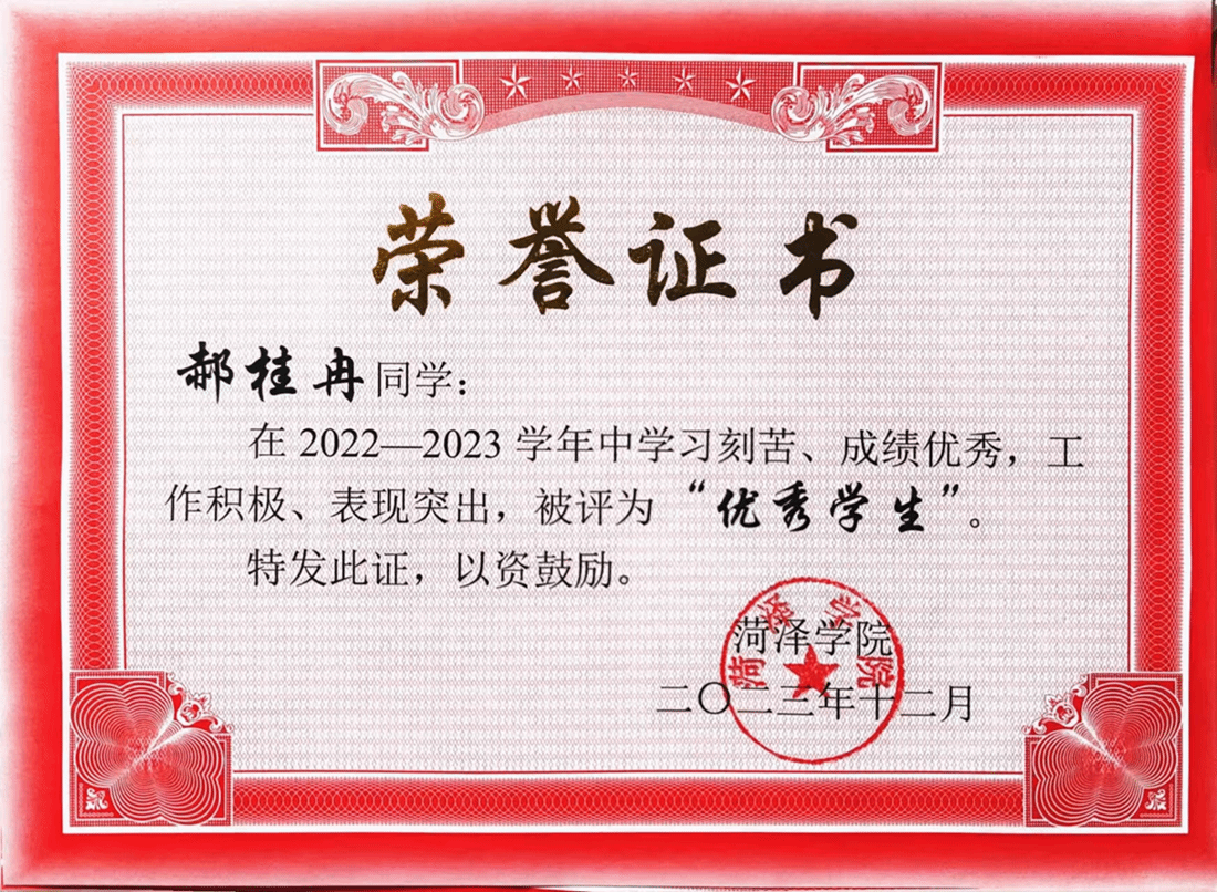 1.自入学以来,郝桂冉始终明确自己的目标,努力钻研,认真学习,在学业中取得较好的成绩,多次获得校级一等奖学金,并荣获“优秀学生”荣誉称号。参与项目《钙钛矿太阳电池中螺烯类空穴传输材料的理论设计和界面性质研究》获得山东省省级立项,在团队合作中不断增强自身责任感。她积极参加大学生职业规划大赛、大学生创客大赛及光电竞赛等多项创新创业竞赛,认真听取老师及同学的建议,努力发挥专业优势,获得2023年首届全国大学生职业规划大赛伟德国际1946bv选拔赛“成长赛道”一等奖。