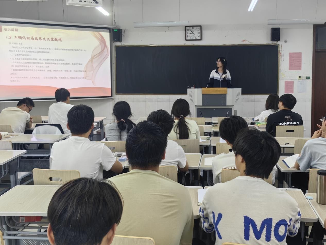 负责演讲的同学从宗教的本质、宗教的社会影响、马克思主义宗教观的核心立场以及看待宗教问题的正确态度等角度切入,系统阐释我国的宗教政策与新时代大学生应秉持的宗教认知。她指出,大学生应坚持唯物史观,既要尊重宗教信仰自由,也要增强对非法宗教活动和邪教组织的警惕性,以理性科学的精神看待宗教问题,坚定马克思主义宗教观。同时她进一步结合现实案例,深入剖析了极端宗教思想对社会稳定的危害,以及正面宗教观在化解矛盾,促进和谐社会的积极作用。