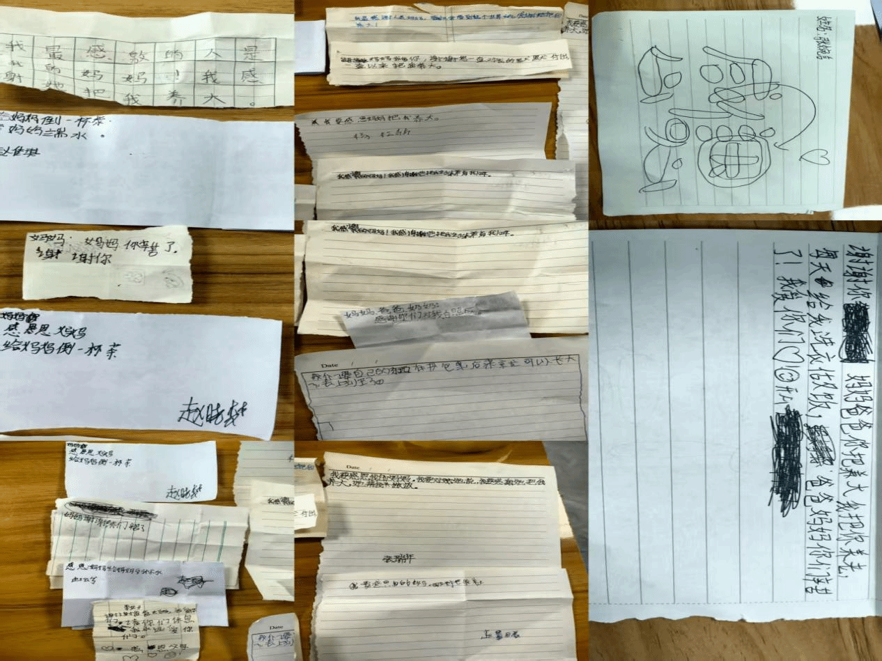 亲情陪伴课上,信纸铺开,孩子们执笔凝思。“爷爷,您教我算收成,我数学进步了”“妈妈,您寄的字典,我已识满一页”……字迹歪扭却字字恳切。不会写字的以画代言:端水的小人、牵着手的祖孙,配上“xie xie”的拼音,将满腔感激凝于尺素。志愿者轻改错字,看着孩子们将信折成纸船,仿佛那船正载着心意漂向家的方向。
