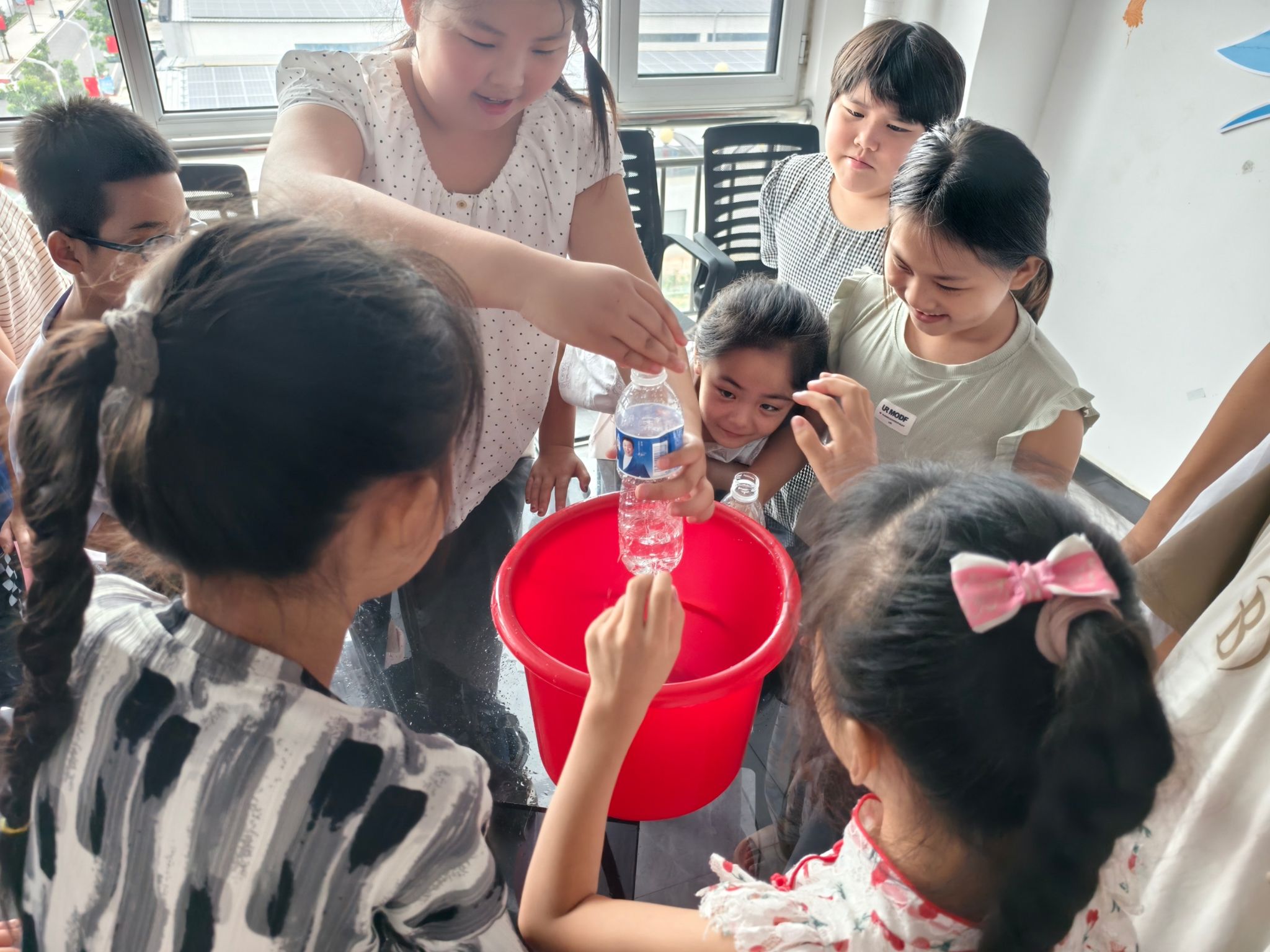 水瓶喷泉:压强奥秘的生动诠释——“杨兴哲老师”的桌前,早已被踮着脚尖、伸长脖子的小小身影围得水泄不通。孩子们屏息凝神,眼巴巴地等待着“奇迹”降临。杨老师熟练地操作:细针刺孔、注水、旋紧瓶盖——小孔处滴水不漏。就在瓶盖旋开的刹那,“噗!”一道清亮的水柱应声喷出,宛若微型喷泉绽放,溅起晶莹的水花。“为什么盖子一紧就不漏啦?”孩子们迫不及待地追问。杨老师微笑着,耐心地通过调节瓶盖松紧,让水柱随着指令“开关自如”。这一刻,抽象的“压强”概念,在孩子们惊喜的瞳孔中,清晰地映照出来,点燃了求知的光芒。
