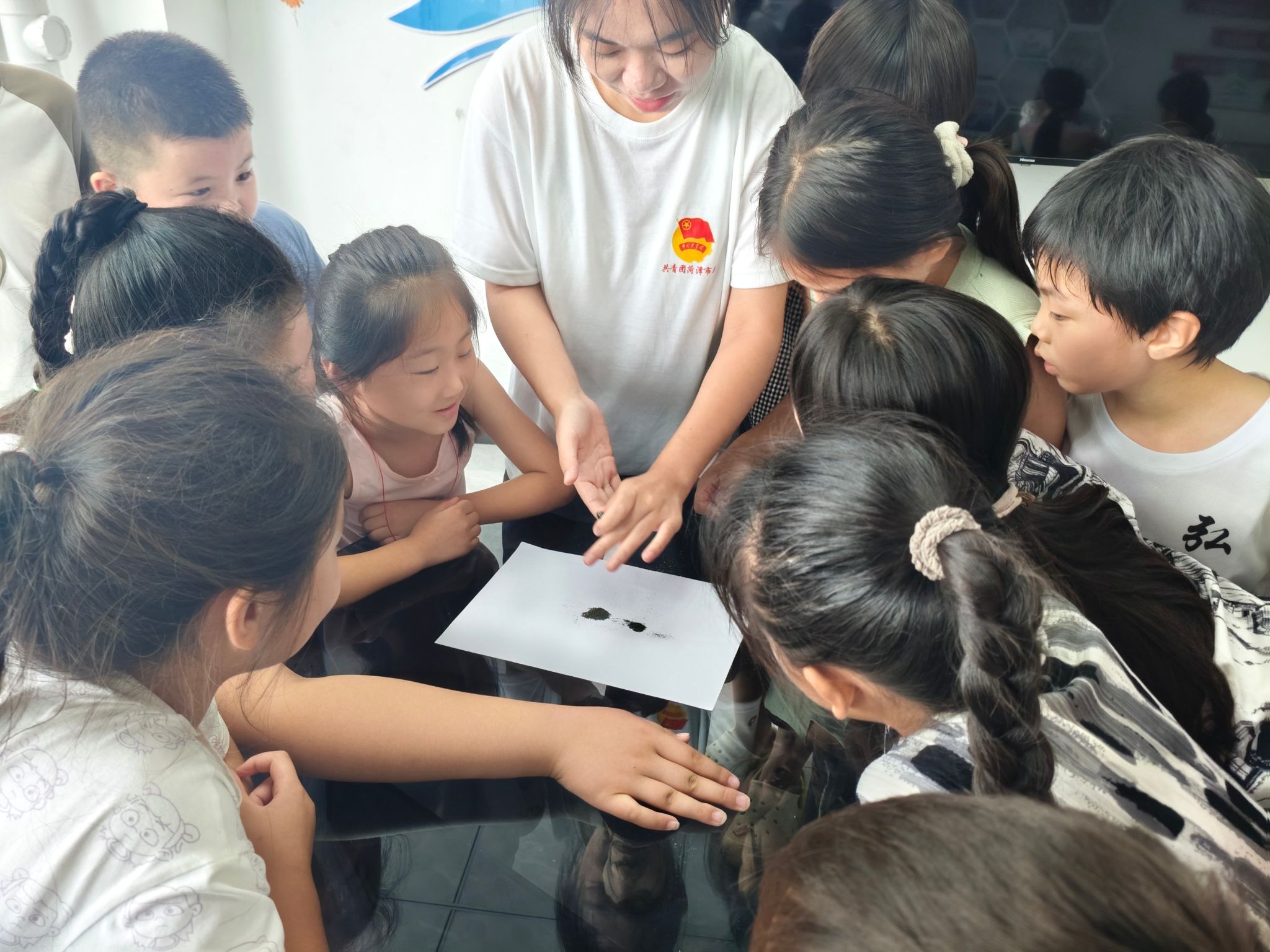 磁末之舞:无形力量的初体验——“快看!它们动起来了!”伴随着一声声清澈的童音,孩子们的目光紧紧聚焦在讲台。当“王雨濛老师”手中的磁铁在纸下轻轻游移,原本散落的磁末仿佛瞬间被赋予了生命,乖巧地沿着无形的轨迹排列出优美的弧线,甚至“粘”附纸面,宛如在演绎一场无声的集体舞蹈。“这就是磁铁的力量,看不见,却真实存在!”王老师温柔地解释着原理,而孩子们早已沉醉于这无形的“魔法”,小脑袋越凑越近,清澈的眼眸里写满了不可思议的惊叹——“哇!”那一声声发自肺腑的惊呼,是对科学奥秘最纯粹、最热烈的初吻。
