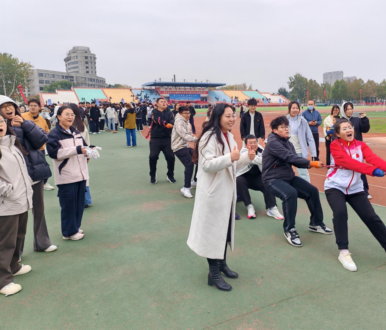 哨声划破长空,比赛瞬间燃爆全场。对阵双方倾身发力,紧攥长绳,足底生根,在一次次节奏鲜明的集体角力中展开拉锯。标志胜负的红布条每一次偏移,都引动全场心跳,此起彼伏的呐喊助威声浪,将赛场气氛不断推向高潮。这是一场力与美的交响,学子们用汗水为团结注解,用激情点燃了整个田径场。
