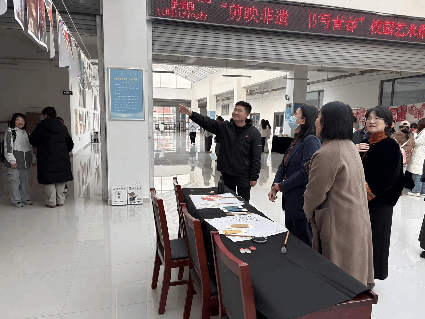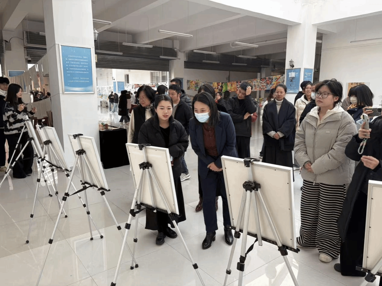 本次展览集结了学生多元形态的原创作品,剪纸的纹理、书法的笔锋、绘画的意境、影像的叙事交织呈现——创作者以青春语态解构非遗基因,用当代艺术语言转译传统美学内核,在“传统肌理”与“青年表达”的碰撞中,既锚定了文化根脉的厚重,又迸发着创新实践的活力。展厅内,师生们驻足各展位前,以沉浸式观展的姿态细察作品细节,围绕非遗与创作的融合维度展开深度交流,文化感知与艺术共鸣的氛围在现场漫溢。
