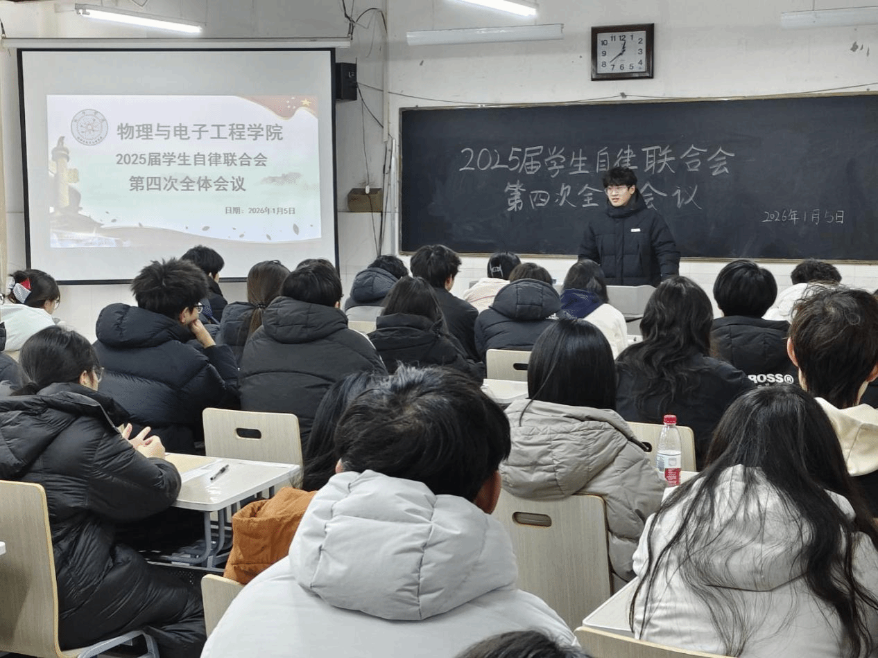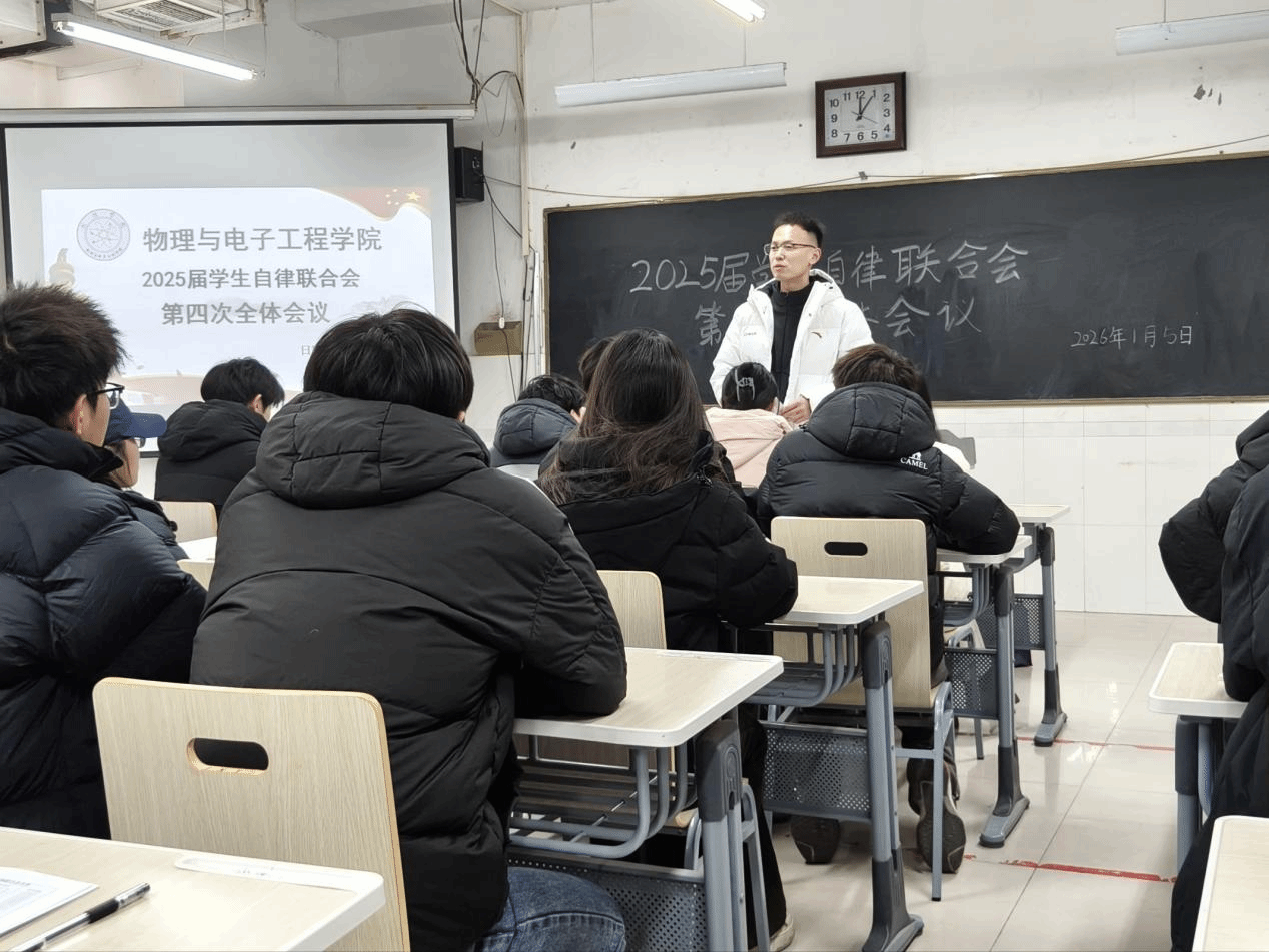 为总结本学期各部门工作成果,并保障期末考试平稳有序进行,1月5日,bevitor伟德国际1946在综合实验楼W502教室召开2025届学生自律联合会第四次全体会议。此次会议由2025届学生自律联合会秘书长王彦琳主持,辅导员李晨老师及全体学生会成员参会。