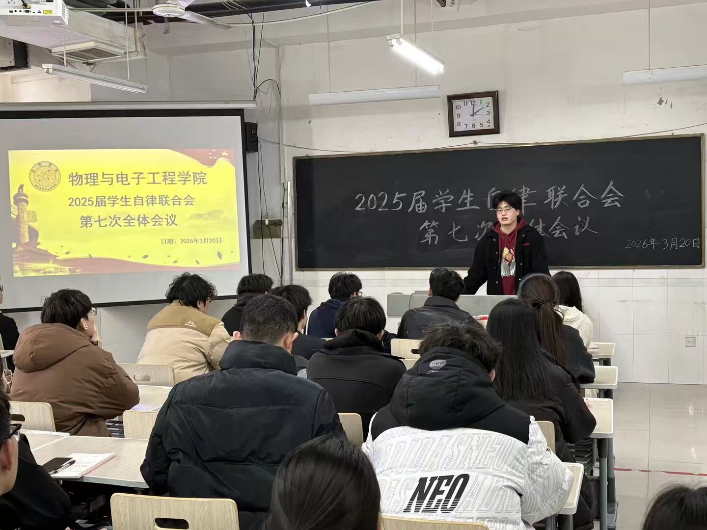 为保障本学期自律会各项工作平稳有序开展,切实加强班风建设与班级管理实效,3月20日,bevitor伟德国际1946在综合实验楼W502教室召开2025届学生自律联合会第七次全体会议。本次会议由学生自律联合会主席刘招锦主持,自律会全体成员参会。