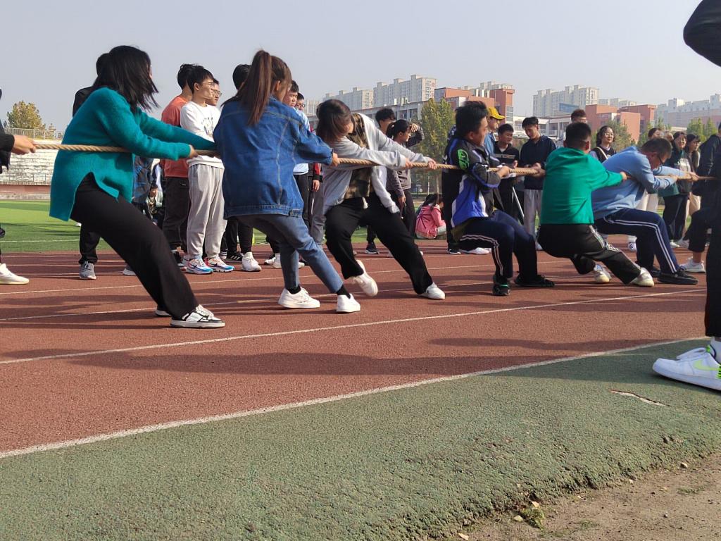 随着裁判一声令下,所有参赛队员都用尽全力紧握长绳,使出浑身解数向后拉。绳子中间的红色丝带左右摇摆起来,双方队员勒绳下腰、降低重心,齐刷刷地向后倒去。未参赛的同学在场地周围为自己的班级呐喊助威,队员们的集体精神化为无限动力,团魂如烈火般燃烧,青春如星光般璀璨。