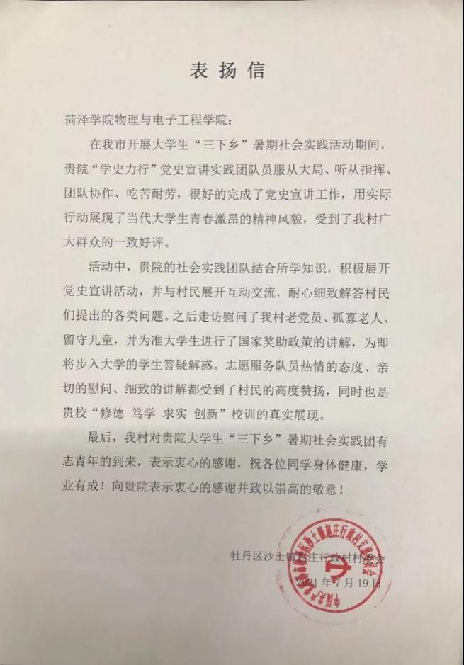 7月19日,bevitor伟德国际1946暑期“三下乡”社会实践团“学史力行”小分队在沙土镇赵庄行政村之行圆满结束并举行总结大会。