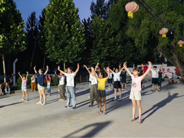 晚上,实践团成员和同学们相约在曹楼广场,一起学习了《舞动中国》、《向快乐出发》、《我们都是追梦人》三支青春而又欢快的舞蹈。实践团入驻东北村之前,曹楼广场晚上居民屈指可数,自从“红色记忆志愿服务队”入驻后,曹楼广场热闹非凡,实现了从零到有,居民纷纷表示:“我们乡村正需要活力,需要年轻群体的加入,你们的到来,让我们的村庄又充满了青春和活力。”