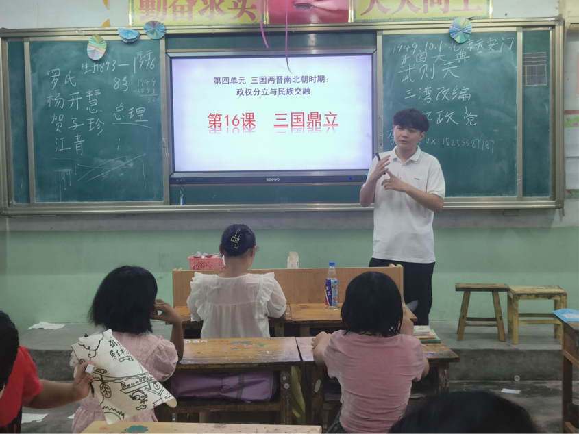 下午,实践团成员李雨彤给同学们上了一节令人心情愉悦的音乐课。接着由孔智慧带领同学们进行了一节充满文化底蕴的历史课,实践团成员带领同学们一同领略了逐鹿之战、黄巾起义能长征两万五千里等历史事件,并进行了详细的解说,在诸多的历史事件中,同学们感受到了穿越时空的快感与对历史事件的深层次的挖掘。
