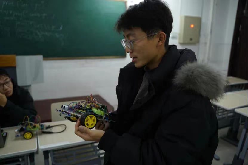 接着,两位社员现场演示80c51芯片的单片机智能车,并讲解超声波模块、红外循迹模块和红外避障模块的运用。最后,社团负责人进行电机和风扇模板实际操作和讲解,并由社员亲自实践。