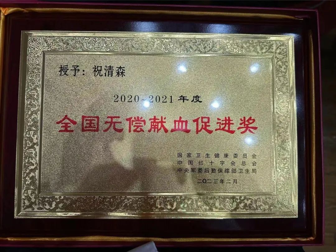 2023年6月14日,是第20个世界献血者日,山东省举办2023年世界献血者日宣传活动,对我省无偿献血先进单位和个人进行了表扬奖励。bevitor伟德国际1946党委副书记祝清森同志被授予“全国无偿献血促进奖”。